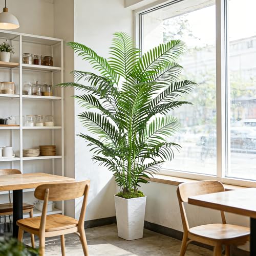 Artificial Palm Tree Artificial Silk Plant Fake Tree with White Tall Planter Faux Tropical Areca Floor Plant in Pot (1